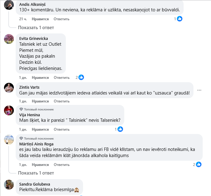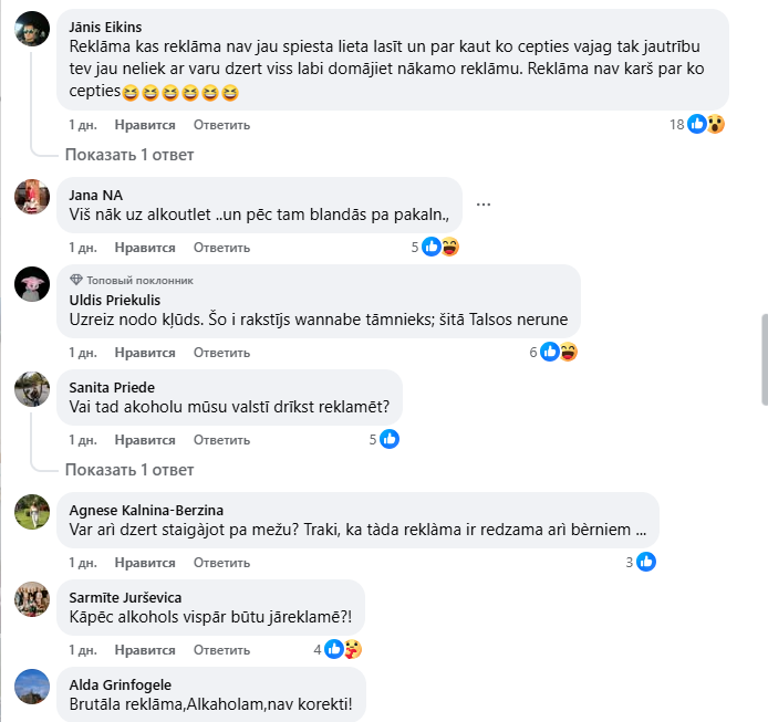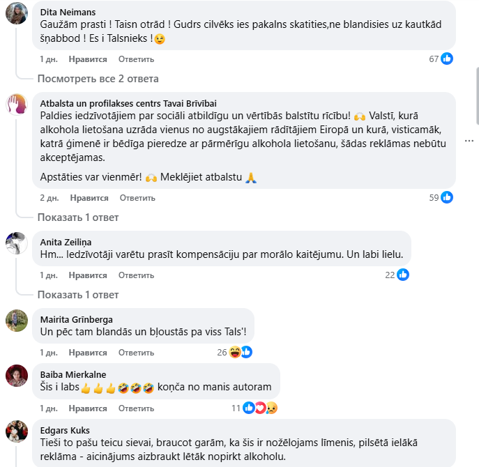 - Atbalsta un profilakses centrs Tavai Brīvībai: «Спасибо жителям за социально ответственное поведение! 🙌 В стране, где потребление алкоголя одно из самых высоких в Европе и где практически в каждой семье есть печальный опыт чрезмерного употребления, такая реклама недопустима. Остановиться можно всегда! Ищите поддержку 🙏»